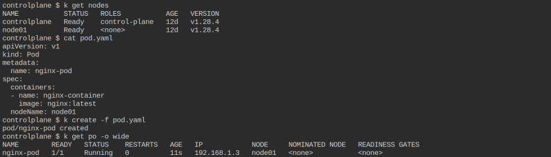 apiVersion: v1 kind: Pod metadata: name: nginx-pod spec: containers: - name: nginx-container image: nginx:latest nodeName: node01
