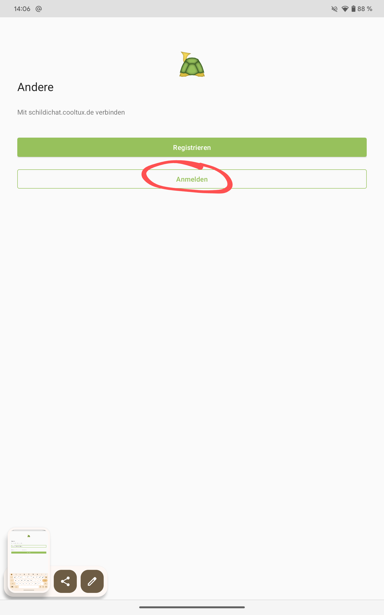 Geht einfach auf die Webseite https://schildichat.cooltux.de und meldet Euch dort über den „Anmelden“ Button an.